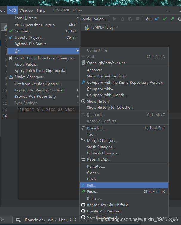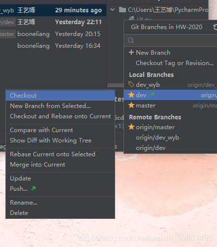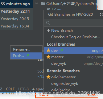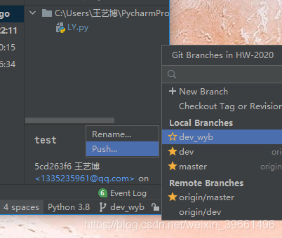 然后点右下角分支图标,选择dev_wyb,选择push,此时整个dev_wyb分支的更新就会推到远程仓库