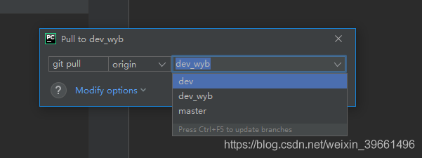 选择dev,然后pull,此时本地的dev分支更新到最新