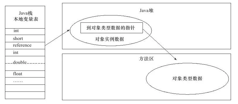 (2):直接指针:reference中存储的直接就是对象地址,java堆中放置访问对象类型数据(存放在方法区)的地址。