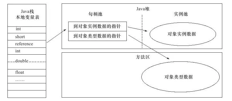 (1):句柄访问:java堆会划分出一块内存作为句柄池,reference存储的就是对象的句柄地址,句柄包含了对象实例数据和类型数据各自的地址信息。