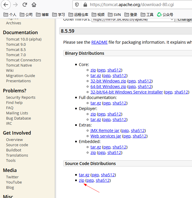 Tomcat下载地址:https://tomcat.apache.org/download-80.cgi