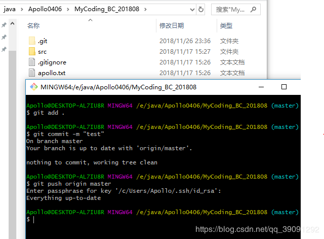 例如coding1_bc_201808是我们需要提交的文件。我们直接将这个文件拖到指定仓库的指定路径下,然后退出到mycoding_bc_201808这个仓库的目录下,进行push操作(由于示例的文件夹已push过了,所以commit的结果是working tree clean):