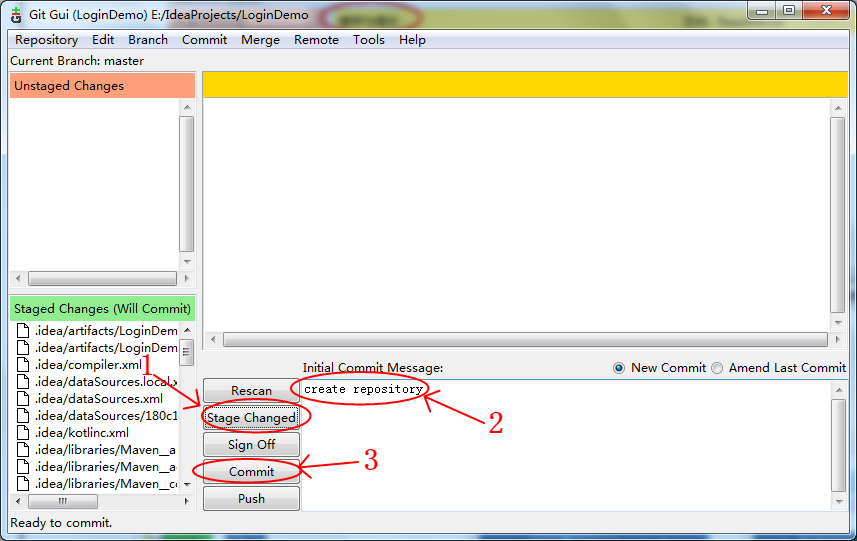 在git gui中,如果unstaged changes(未缓存的改动)中包含文件,则先点击stage changed,将未缓存的改动加入缓存,再点击commit;否则需要先点击rescan扫描项目中进行过改动的文件。注:提交描述必须要填写,不然无法提交。