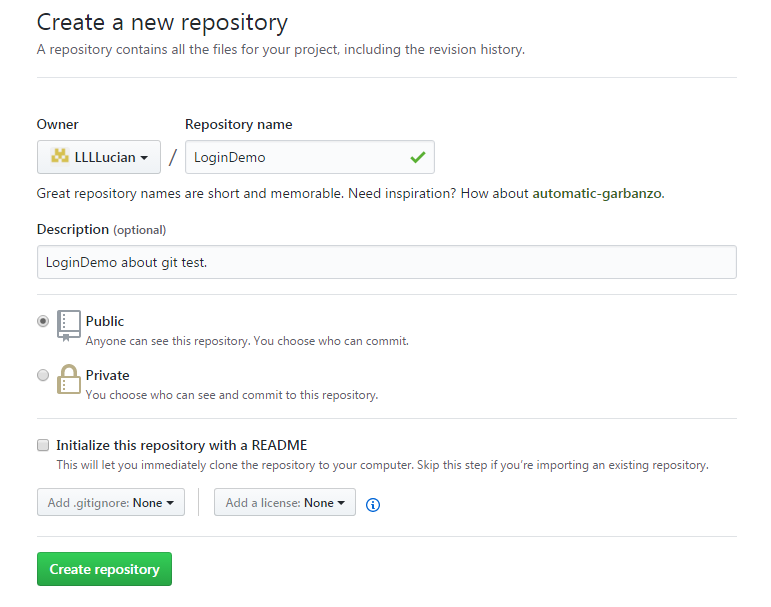 首先,我们需要在有一个自己的github帐户,然后在github上新建一个repository,名字也叫做logindemo(可以和本地项目名不一样)。