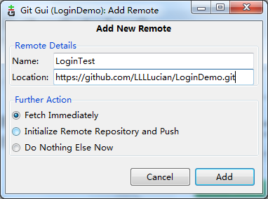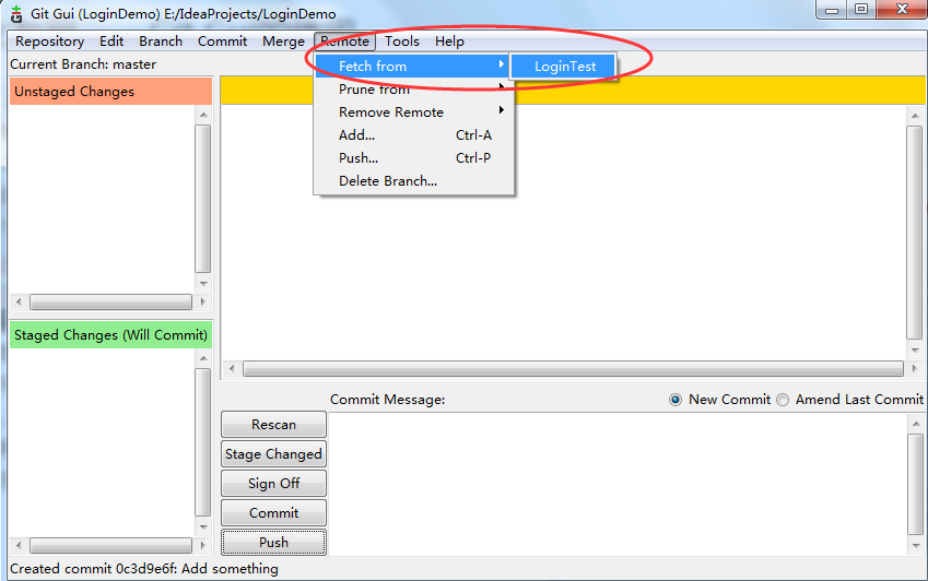 设想多人参与项目开发,每个人都只push到远程,完全不顾其他成员的进度,这样的开发模式无疑是有问题的。我们最好的做法是,每次push到远程的时候,先从远程把目前进度fetch下来,在和自己目前项目进度merge后,再将它push到远程。打开git gui,在菜单栏中选择remote->fetch from->logintest,便可以从远程服务器更新到本地,但是尚未与自己当前项目合并。
