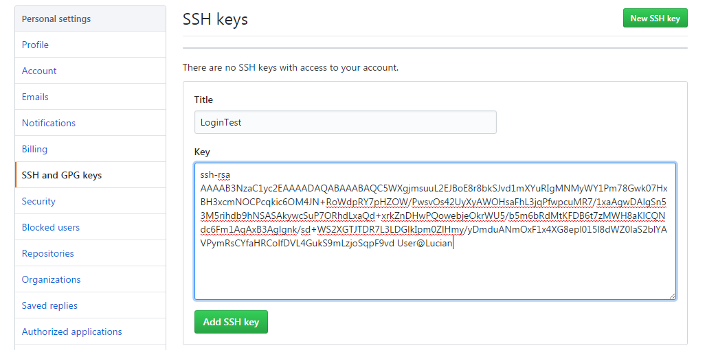 然后在github的personal settings中添加它,title随意,可以用home,company等作为标识来区别。