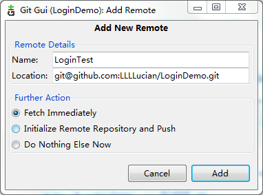 在git gui中,选择remote->add添加远程服务器,远程服务器信息有两种填写方式,填写https地址或ssh地址,对应github项目的https和ssh地址,推荐使用ssh方式。