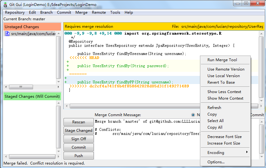 如果本地有一个方法名叫finduser,而远程服务器中该方法的名字改变了,例如变成了findpassword,则合并遇到冲突,可以右键空白部分选择保留本地版本或远程版本进行合并(图中绿色的代码表示冲突部分)。