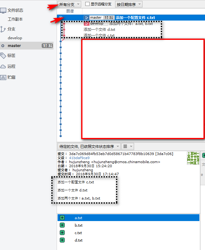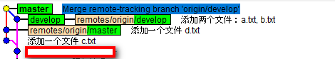 6、可以看到master上之后又1条提交记录了,而develop上还有3个提交记录