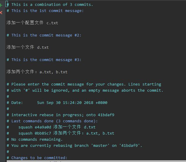 上面未被注释的部分列出的是我们本次rebase操作包含的所有提交,下面注释部分是git为我们提供的命令说明。每一个commit id 前面的pick表示指令类型,git 为我们提供了以下几个命令: