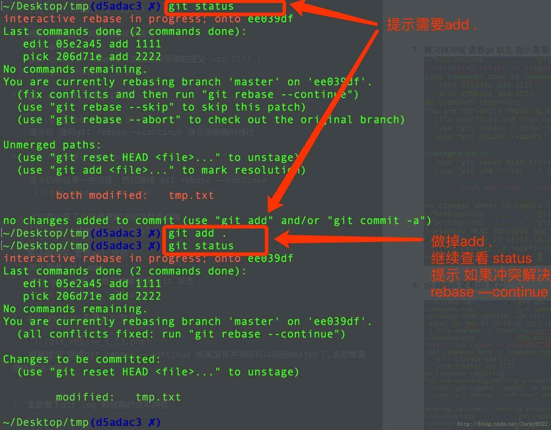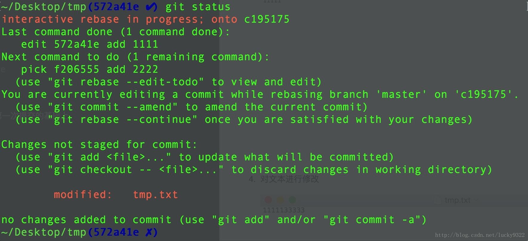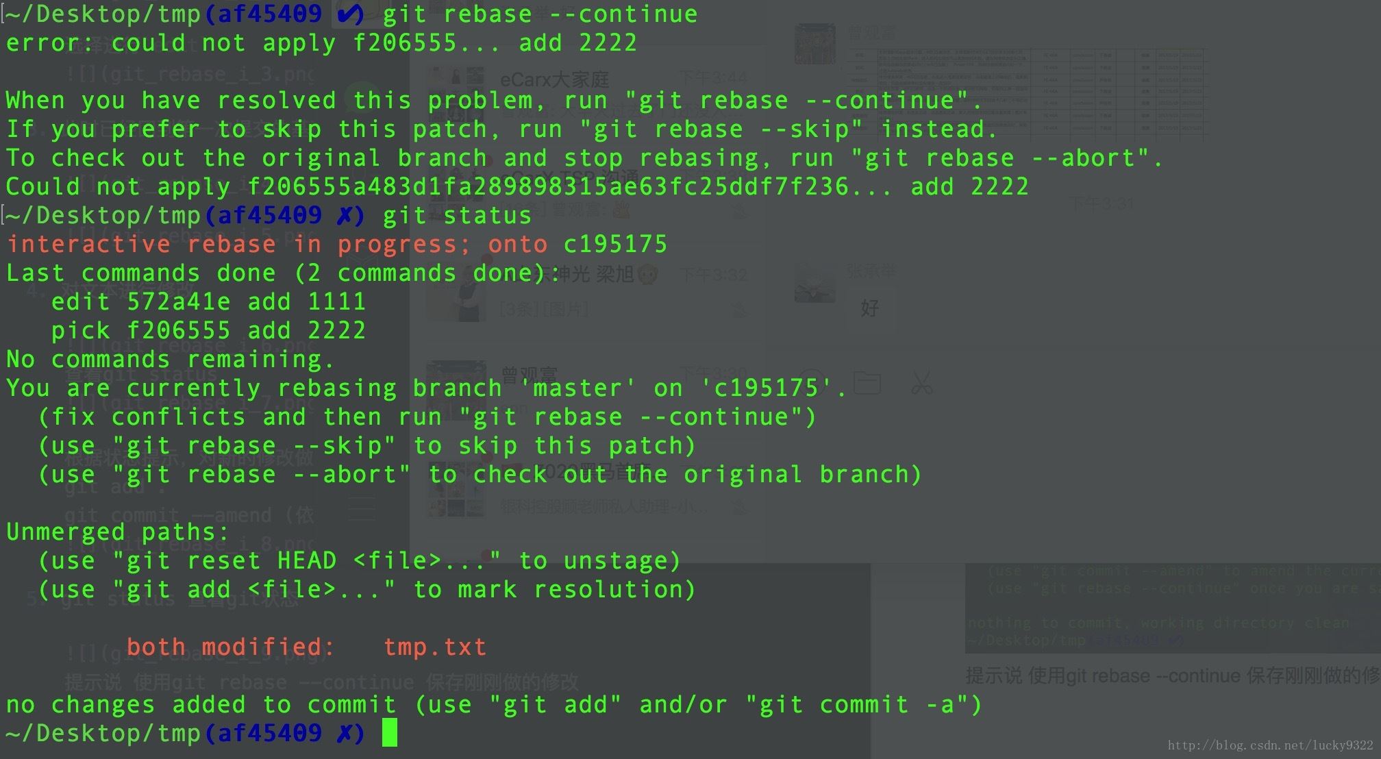 提示说 使用git rebase –continue 保存刚刚做的修改