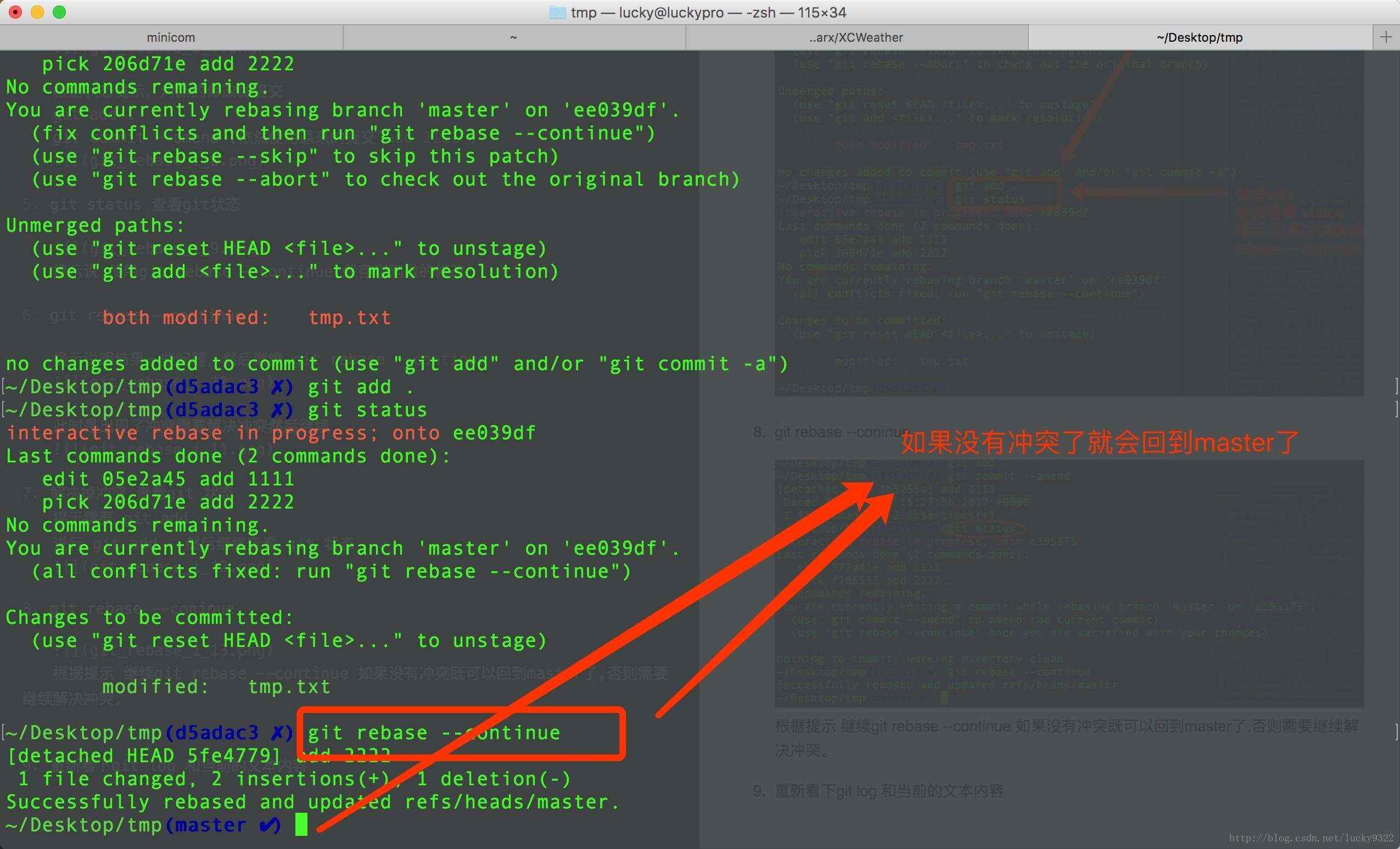 根据提示 继续git rebase –continue 如果没有冲突既可以回到master了,否则需要继续解决冲突。