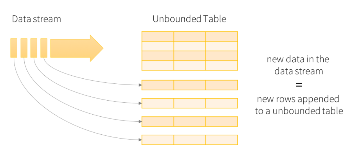 structured streaming将实时数据当做被连续追加的表。流上的每一条数据都类似于将一行新数据添加到表中。