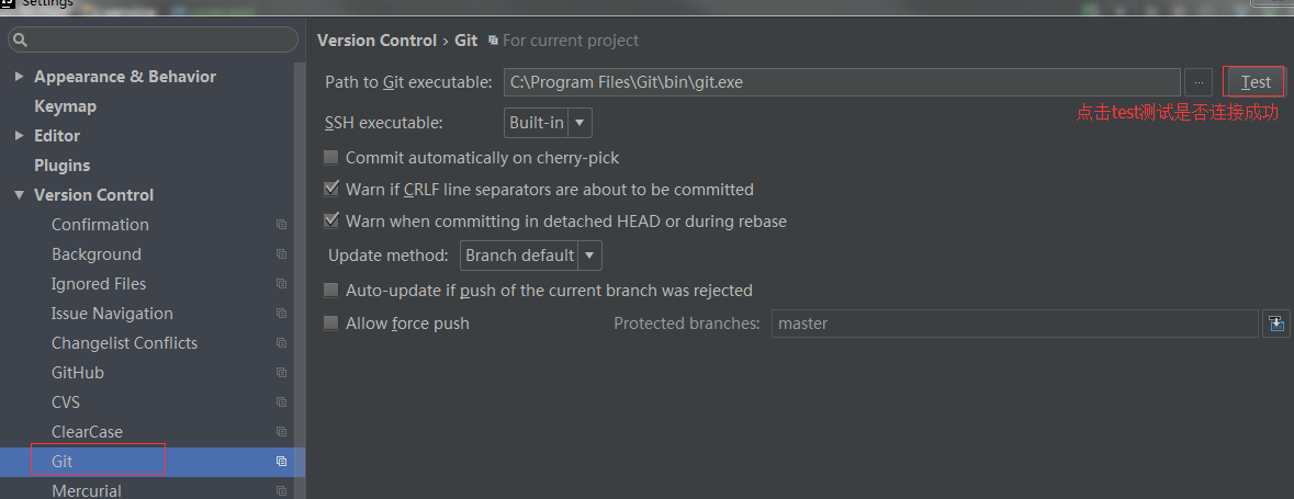 4.1:先点击file->setting->git 然后出现如下界面