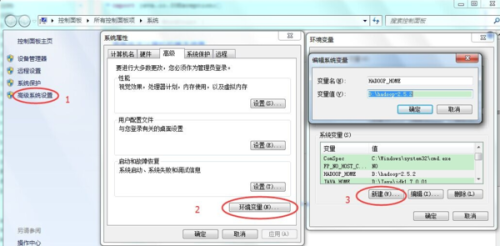 1、配置环境变量:把下载好的hadoop-2.5.2解压到d盘的根目录下,然后计算机==》属性==》高级系统设置==》环境变量