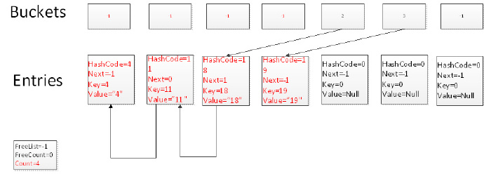 我们添加18,让HashCode再次碰撞到Buckets中下标为4的槽上,这个时候新元素添加到count+1的位置,并且Bucket槽指向新元素,新元素的Next指向Entries中下标为1的元素。此时你会发现所有hashcode相同的元素都形成了一个链表,如果元素碰撞次数越多,链表越长。所花费的时间也相对较多。