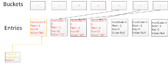 其中this.buckets主要用来进行Hash碰撞,this.entries用来存储字典的内容,并且标识下一个元素的位置。