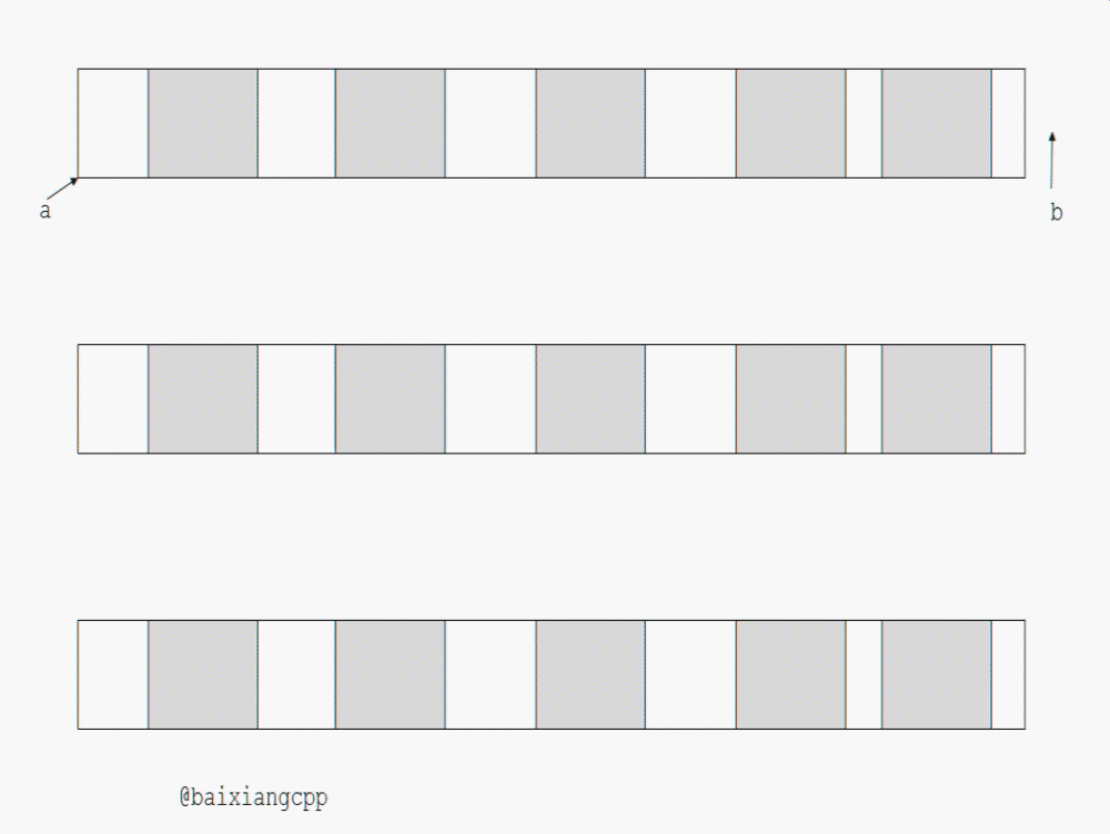 和上边的regex_search()一样,regex_iterator的构造函数中也有std::regex_constants::match_flag_type类型的参数,用法一样。其实regex_iterator的内部实现就是调用了regex_search(),这个参数是用来传递给regex_search()的。用gif或许可以演示的比较形象一点,具体是这样工作的(颜色加深部分,表示可以匹配的子序列):