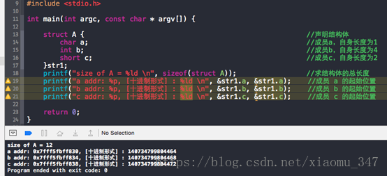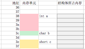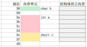 对于结构体的第一个成员 a,起始位置为0x…38 (也为 4 的倍数),所占内存为 0x…38 ~ 0x…3b,共占4个字节;