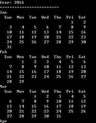 打印日历应该是程序员入门时候的一个基础练习。打印一年的日历有许多不同的实现,我这里提一个可以实现的方法。首先需要确定该年是闰年还是平年,闰年的二月是29天,全年是366天;平年二月是28天,全年365天。还需要确定该年的每一天是星期几。从0001年1月1日是星期一开始,该值可以通过使用该年到元年的总天数模7来求得。最后考虑怎样输出日历,可以先将日历存储在一个二维数组里面,也可以直接将它输出。