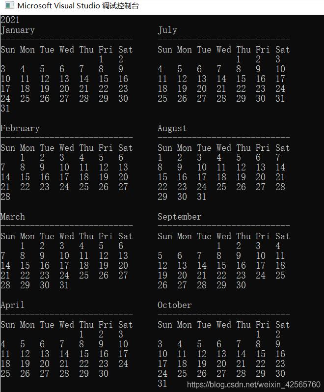 输入一个年份(1970以后的),以 2*6 的格式打印当年的日历。