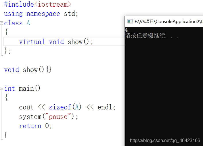 对比上面两种情况,空类大小为1,但是函数又不占用空间,为什么函数变为虚函数却变成了4呢?