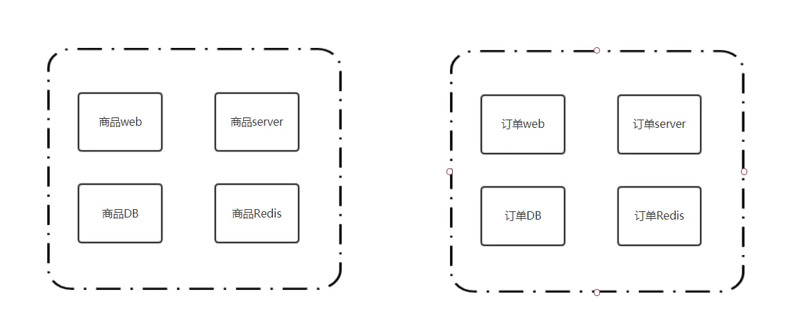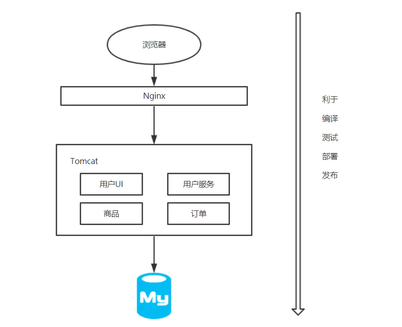 单体应用满足不了日趋增长的需求之后,微服务出现了。我们利用微服务的思想,将原来的单体应用进行微服务化。将原来集中于一体的功能(如商品、订单服务)进行拆分,每个功能模块又各自的自成体系的发布、运维等功能。这样就解决了单体应用的弊端,如下: