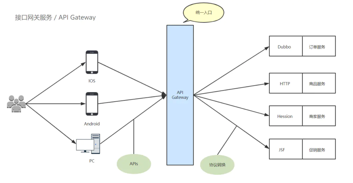 这时,我们还没有看到API Gateway。举例来说,原先IOS、Android、PC客户端调用服务的地方,需要多个URL地址,有订单的、商品的、用户的。微服务化后就必须有统一的出入口,这种情况下,API Gateway就出现了。API Gateway很好的解决了微服务下调用、统一接入等问题,如下图所示: