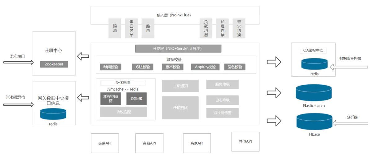 除了基本的四大功能,网关运行良好的环境还包括注册中心(比如:ZK读取已发布的API接口的动态配置)。为了实现高性能,将数据全部异构到缓存(如:Redis)中,同时还可以配合本地缓存来进一步提高网关系统的性能。为了提高网关的吞吐率,可以使用NIO+Servlet 3 异步的方式,还可以利用Servlet 3 的异步特性将请求线程与业务线程分开,为后续的线程池隔离做好基本的支撑。访问日志的存储我们可以放到Hbase中,如果要作为开放网关使用,那么需要一个支持OAuth2.0的授权中心。还可以引入Nginx + lua的方式将一些基本的校验判断放到应用系统之上,这样可以更轻量化的处理接入的问题,整体的网关架构示例如下所示: