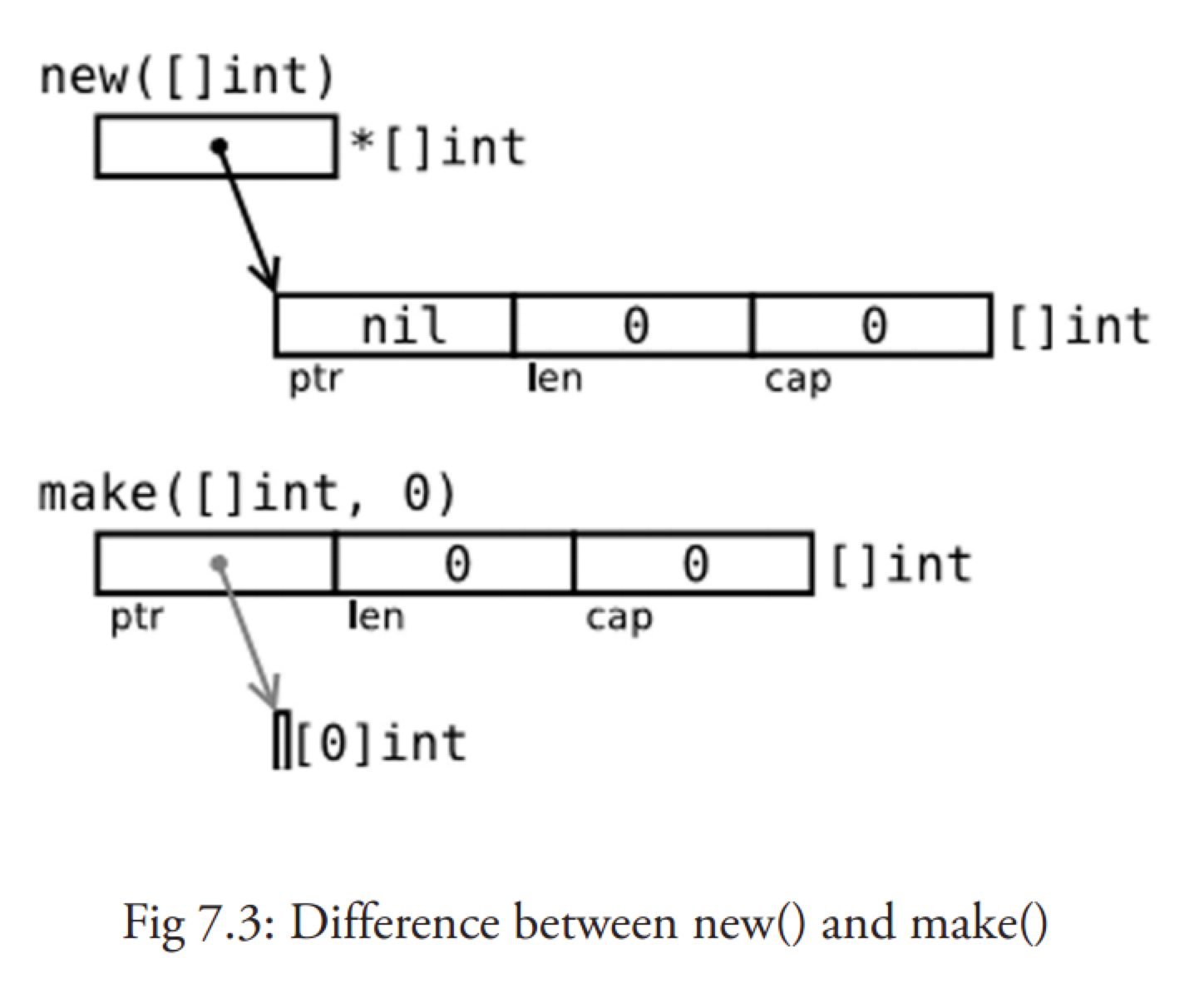 make(T)返回一个类型为T的初始值,它只适用于3中内建的引用类型:切片,map和channel