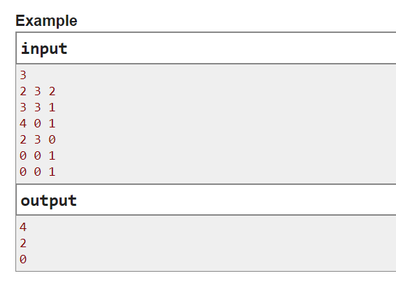#include<bits/stdc++.h> #define endl '\n' #define null NULL #define ll long long #define int long long #define pii pair<int, int> #define lowbit(x) (x &(-x)) #define ls(x) x<<1 #define rs(x) (x<<1+1) #define me(ar) memset(ar, 0, sizeof ar) #define mem(ar,num) memset(ar, num, sizeof ar) #define rp(i, n) for(int i = 0, i < n; i ++) #define rep(i, a, n) for(int i = a; i <= n; i ++) #define pre(i, n, a) for(int i = n; i >= a; i --) #define IOS ios::sync_with_stdio(0); cin.tie(0);cout.tie(0); const int way[4][2] = {{1, 0}, {-1, 0}, {0, 1}, {0, -1}}; using namespace std; const int inf = 0x7fffffff; const double PI = acos(-1.0); const double eps = 1e-6; const ll mod = 1e9 + 7; const int N = 2e5 + 5; int t, n, x1, y1, z1, x2, y2, z2; signed main(){ IOS; cin >> t; while(t --){ cin >> x1 >> y1 >> z1; cin >> x2 >> y2 >> z2; int ans = 0; int cnt1 = min(z1,y2); ans += cnt1*2; z1 -= cnt1; y2 -= cnt1; int cnt2 = min(x1,z2); x1 -= cnt2; z2 -= cnt2; if(z2 && z1 < z2) ans -= (z2-z1)*2; cout << ans << endl; } return 0; }