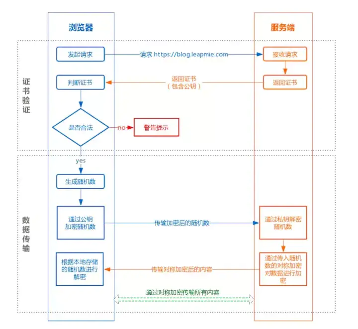 HTTPS 的整体过程分为证书验证和数据传输阶段,具体的交互过程如下: