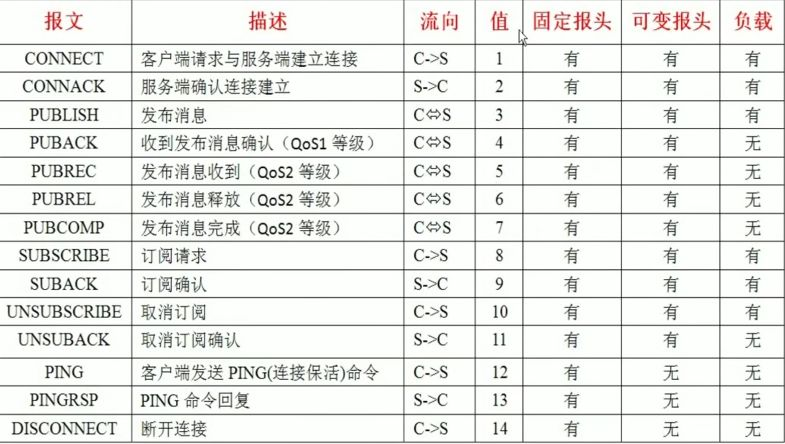 - 固定头(Fixed header):存在于所有的 MQTT 数据包中,用于表示数据包类型及对应标识,表明数据包大小;