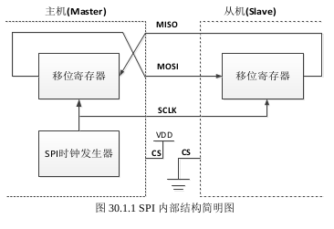 从图中可以看出,主机和从机都有一个串行移位寄存器,主机通过向它的 SPI 串行寄存器写入一个字节来发起一次传输。寄存器通过 MOSI 信号线将字节传送给从机,从机也将自己的移位寄存器中的内容通过 MISO 信号线返回给主机。这样,两个移位寄存器中的内容就被交换。