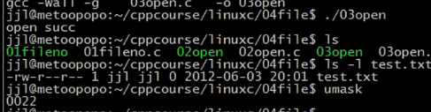 若注释掉umask(0),则与预期设置的0666不一样,这是由于umask造成的