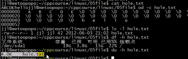 od -c XXX.txt查看空洞文件