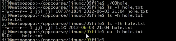 使用ls -lh查看的文件大小为1G多,实际在磁盘上的数据并没有1G多。实际上1G多的空洞文件并不存放在磁盘上,只保存必要信息