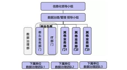 图2是典型的中国式数据治理组织架构,数据治理/管理领导小组设在信息化领导小组之下,可以单设,也可以是信息化领导小组的一个职责,而虚框中的数据治理部门可能是实体部门,也可能是由牵头业务部门和IT部门联合组成的虚拟团队。