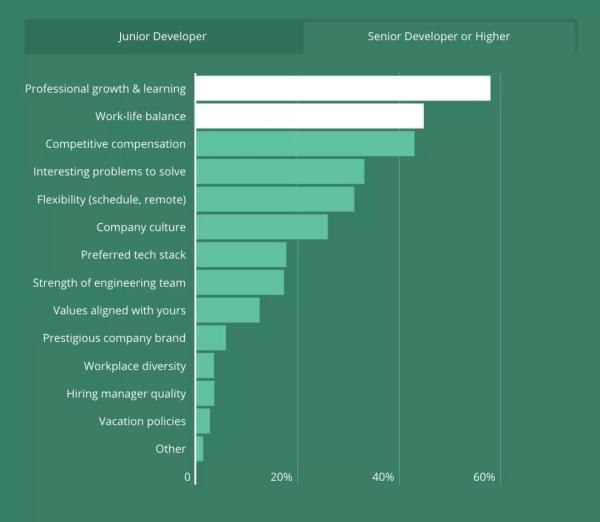 初级开发者和高级开发者找工作最看重的东西排名前三名是一致的:个人成长和学习空间、其次是工作与生活的平衡,也就是加班的多少、排名第三的是有竞争力的薪酬。