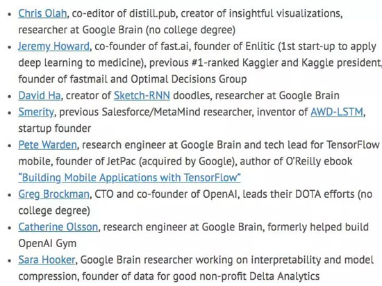 一部分在深度学习领域有贡献的非PHD:http://www.fast.ai/2018/08/27/grad-school/