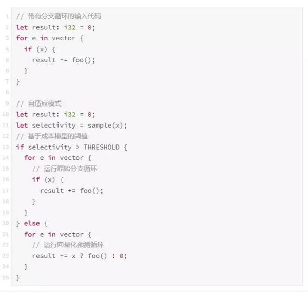 Weld 的自适应优化器为预测生成代码,用于对 x 进行采样,以便在运行时获得选择性的近似。然后,根据获得的测量值,将在运行时使用设置了阈值的成本模型来选择是否进行预测。下面的代码展示了自适应预测转换:
