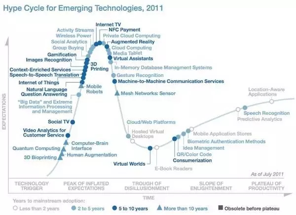 Gartner把“大数据”的发展阶段定位在“社交电视”和“移动机器人”之间,正向着中部期望的高峰点迈进,而现在是达到较为成熟的阶段前的二至五年。这种定位有着其合理性。各种奏唱着“大数据”颂歌的产品数量正在迅速增长,大众媒体也进入了“大数据”主题的论辩中,比如纽约时报的“大数据的时代“,以及一系列在福布斯上发布的题为” 大数据技术评估检查表“的文章。