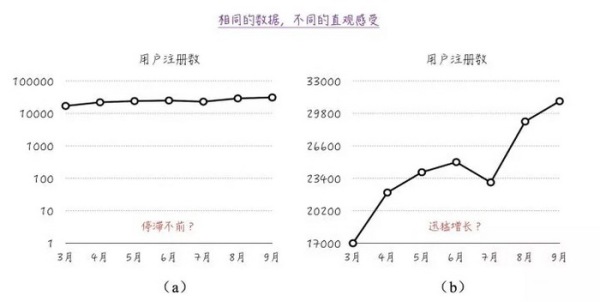 如图4所示,我们将某APP每月的用户注册数表示在图中。图4a给人的直观印象是每月的安装数是大致差不多的,没有明显的增长。而图4b给人不同的印象,从3月份开始,用户注册数大幅度增长。但其实两幅图的数据是一模一样的,给人不同的感觉是因为图4a中纵轴的起点是0,而且使用了对数尺度;而图4b的纵轴是从17000开始的,而且使用的是线性尺度。