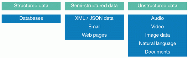 请注意,定义为非结构化数据的大部分数据实际上都拥有结构(比如一个包含元数据和内容标签的文档),但内容本身缺乏结构,而且无法直接使用。因此,它们被视为非结构化数据。