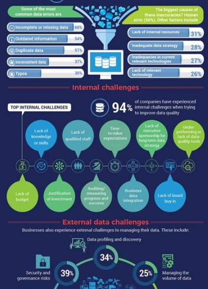 一些组织比较注重大数据的应用,但是尝试收集和分析高质量数据时会遇到一些重大挑战。事实上,94%的组织在尝试改进数据时遇到问题。出现的一些问题包括缺乏知识,技能和人员等问题,而其他一些问题是发现有经济障碍。而来自外部的问题包括安全风险,庞大的数据量,以及管理传入数据流的问题。