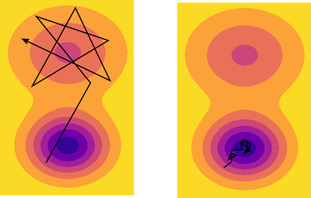随机梯度下降并不难,最近的工作表明该步骤实际上是一个马尔可夫链,在特定假设下有一个静态分布,可被看作是对 posterior 的变分近似。所以当你停止你的 SGD 并采用最后的参数时,你基本上是在从这一近似分布中采样。我发现这一想法很有启发力,因为优化器的参数通过这种方式发挥了很大作用。比如,由于你可以增加 SGD 的学习参数,马尔可夫链会变的不稳定直到找到大面积采样的局部极小值;即,你增加了步骤的方差。另一方面,如果你减少学习参数,马尔可夫链会慢慢近似更窄的极小值,直到它在严密区域内收敛;即,你增加了一个特定区域的方差。另一个参数,SGD 中的批大小,也控制着算法收敛的区域类型。对于小批的更宽广区域,以及更大批的更窄区域。