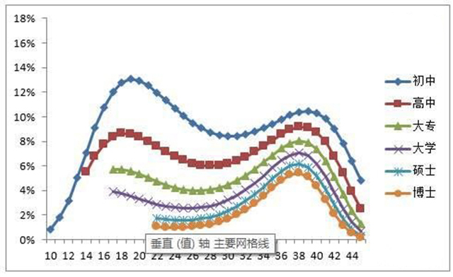 2.在高文化程度人群中,开始向34岁-40岁扩散,呈现大幅增长,并形成一个峰值。