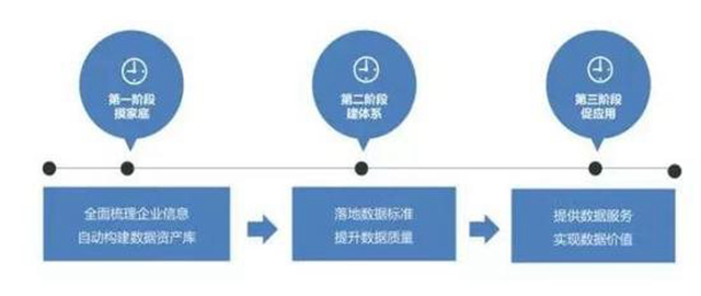 大数据治理从建设内容和实施目标上可以划分成不同的阶段,每个阶段完成不同的任务,随着阶段的递进,建设内容逐步加深,不同的企业切入点和诉求也各不相同。大致分为以下几个阶段: