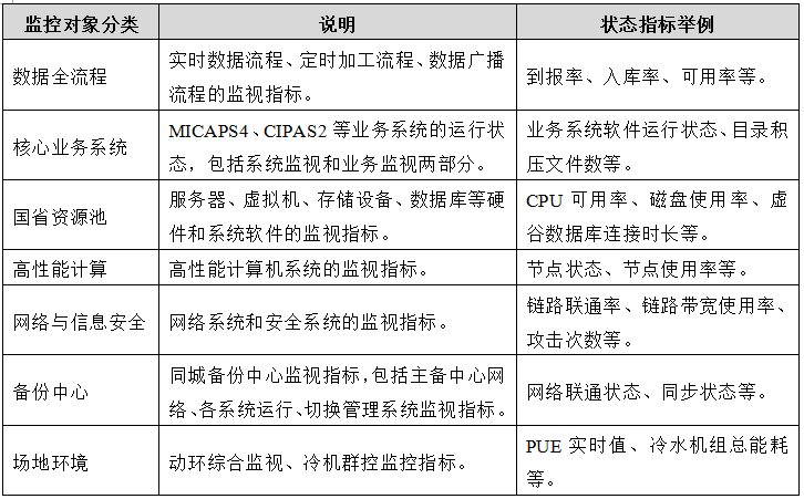 监视对象不同,监视的目的和判识状态的标准也不相同,监视服务器及存储设备是考察它是否正常运行、以及其CPU、内存和存储空间的使用情况,监视业务流程是考察其在规定的时间节点上游数据的到达情况以及到达数据的质量,监视业务应用系统则主要考察应用软件自身的运行情况以及业务工作(如数据处理)的实际情况,等等。参见表1: