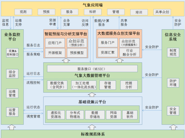 气象大数据云平台提供气象应用开源框架,集成丰富的预报分析模型,支撑智能预报预测系统构建和运行;提供多源数据汇聚和挖掘分析能力,支撑大数据服务和社会众创。对数据和业务的全流程进行可视化监控管理,对数据和基础设施资源进行科学化调度管理和智能化运营。基于专有云和公共云,为气象业务和众创应用提供集约高效、按需供给的软硬件基础设施资源,对数据、系统、设施等提供可靠、全方位的安全防护【2】。